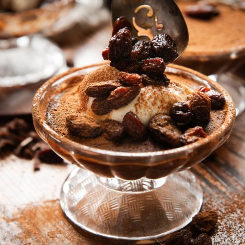 Chocolate Pudding “Tiramisu” with Coffee and Bourbon-Soaked Raisins